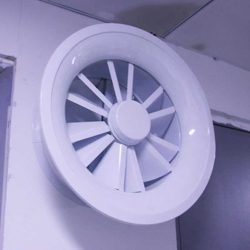 旋流风口是空调系统中的一个送风工具。在空调通风系统中可用作大风量,大温差送风以减少风口数量,安装在天花板或顶棚上,可用于3米以内低空间,也可用二种高度大面积送风。