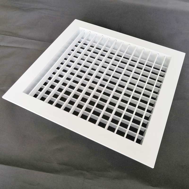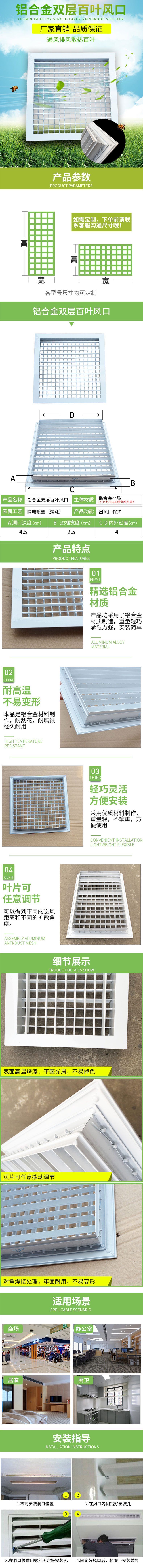 双层百叶风口,广泛应用于空调系统中作送风口,根据使用要求,风口后面可配制铝制风量调节阀(人字闸),双层百叶风口具有两层相互垂直页片调节水平和垂直页片的角度。
