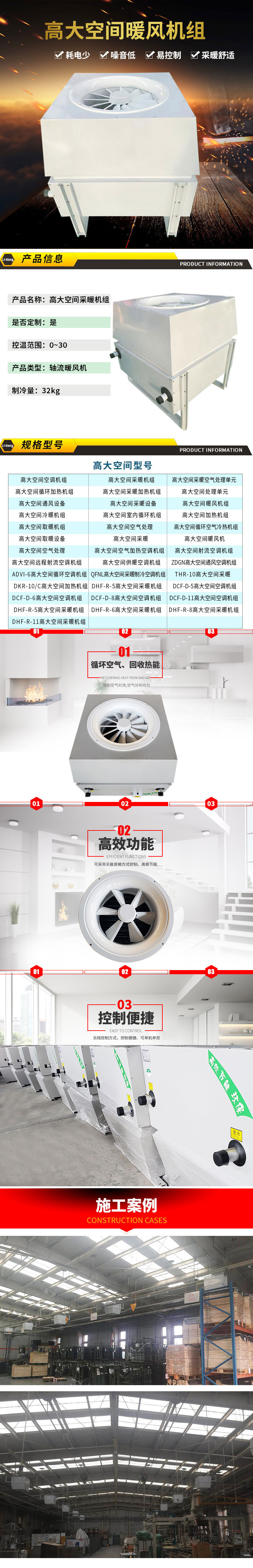 高大空间暖风机是指采用离心式风机,其气流射程长、风速高、送风量大、散热量大,因而选用时可按集中送风设计考虑,这类大型暖风机是由地脚螺栓固定在地面的基础上。