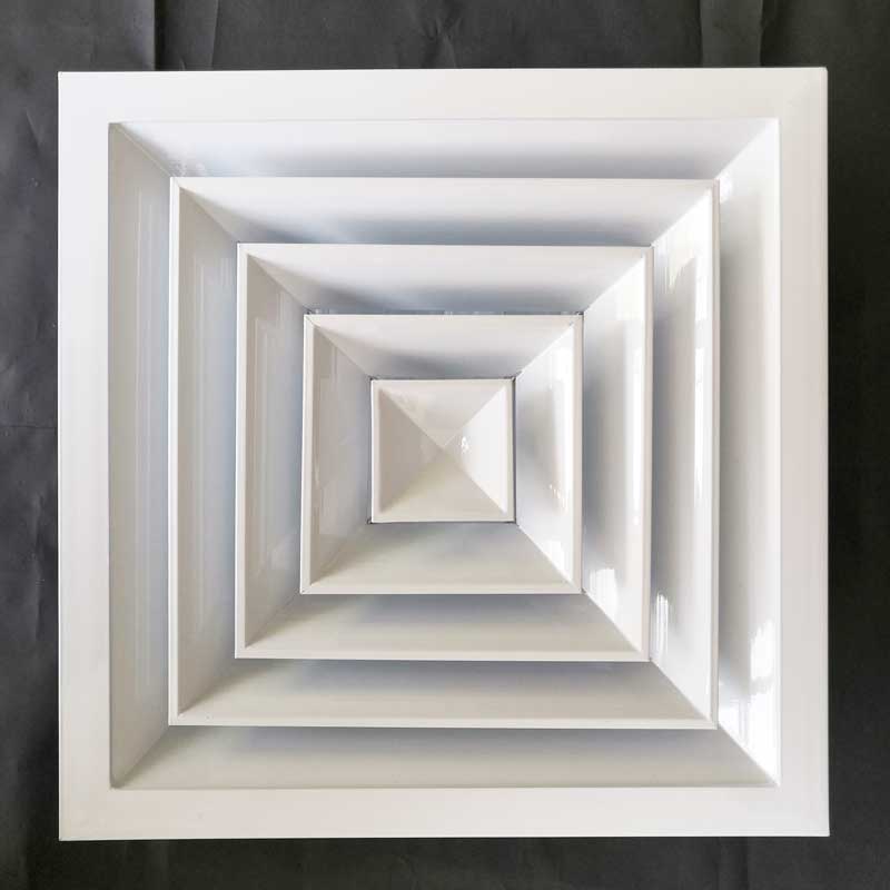 方形散流器(铝合金散流器)优点及适用范围:气流属贴附(平送)型,适用于播音室、医院、剧场、教室、音乐厅、图书馆、游艺厅、剧场休息厅、一般办公室、商店、旅馆及体育馆等。
