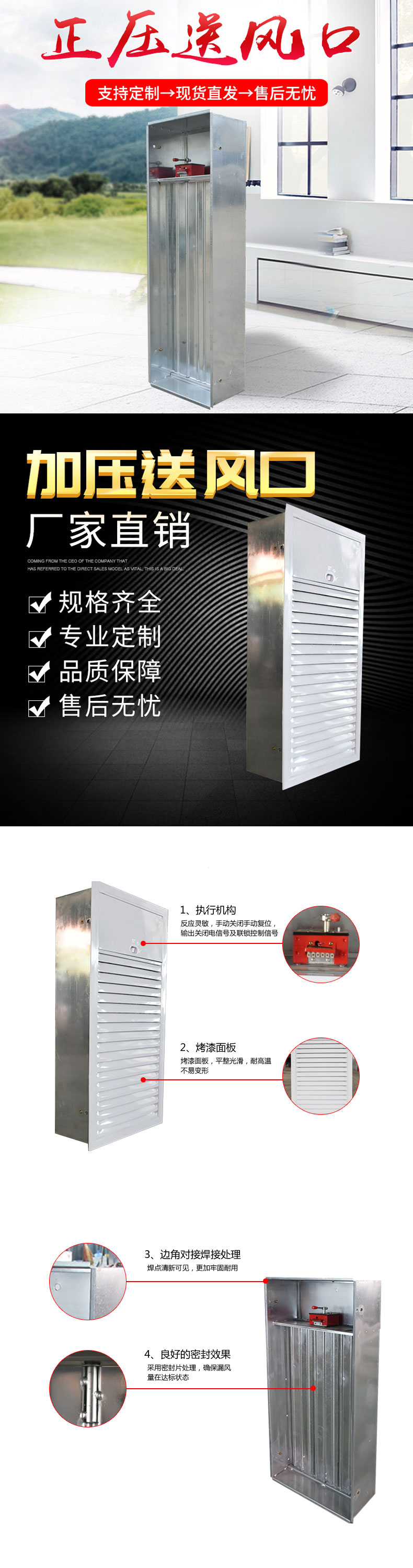多叶排烟口是用于发生火灾时加压送风,通过正压送风口会源源不断的对前室进行送风,使前室维持正压,保证烟气不会在这个区域蔓延,而给人逃生的空间的。