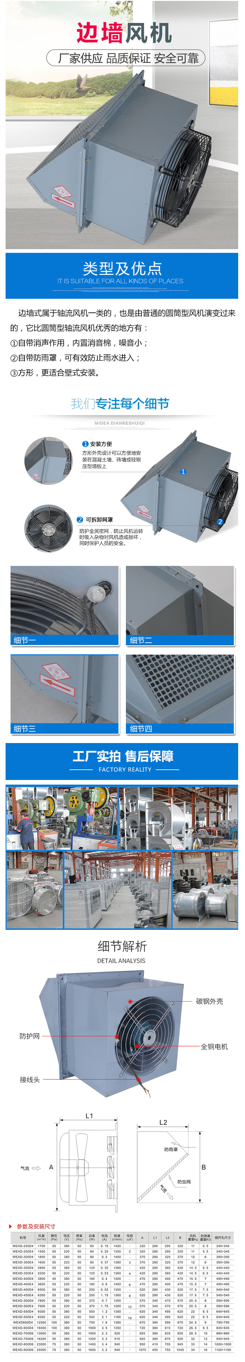 边墙风机采用先进的前掠型叶片、低噪音的外转子或内转子风机专用电机直联传动,方形外壳设计可以方便地安装在混凝土墙、砖墙或轻钢压型墙板上,方形防雨罩结构牢固,外形美观。